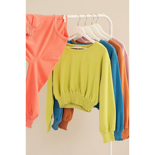 HERE TO WOW BRUSHED KNIT SMOCKED CROP TOP: LAVENDER / L