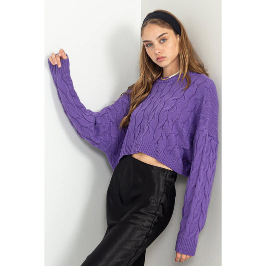WEEKEND READY CABLE KNIT LONG SLEEVE CROP SWEATER: WISTERIA / L